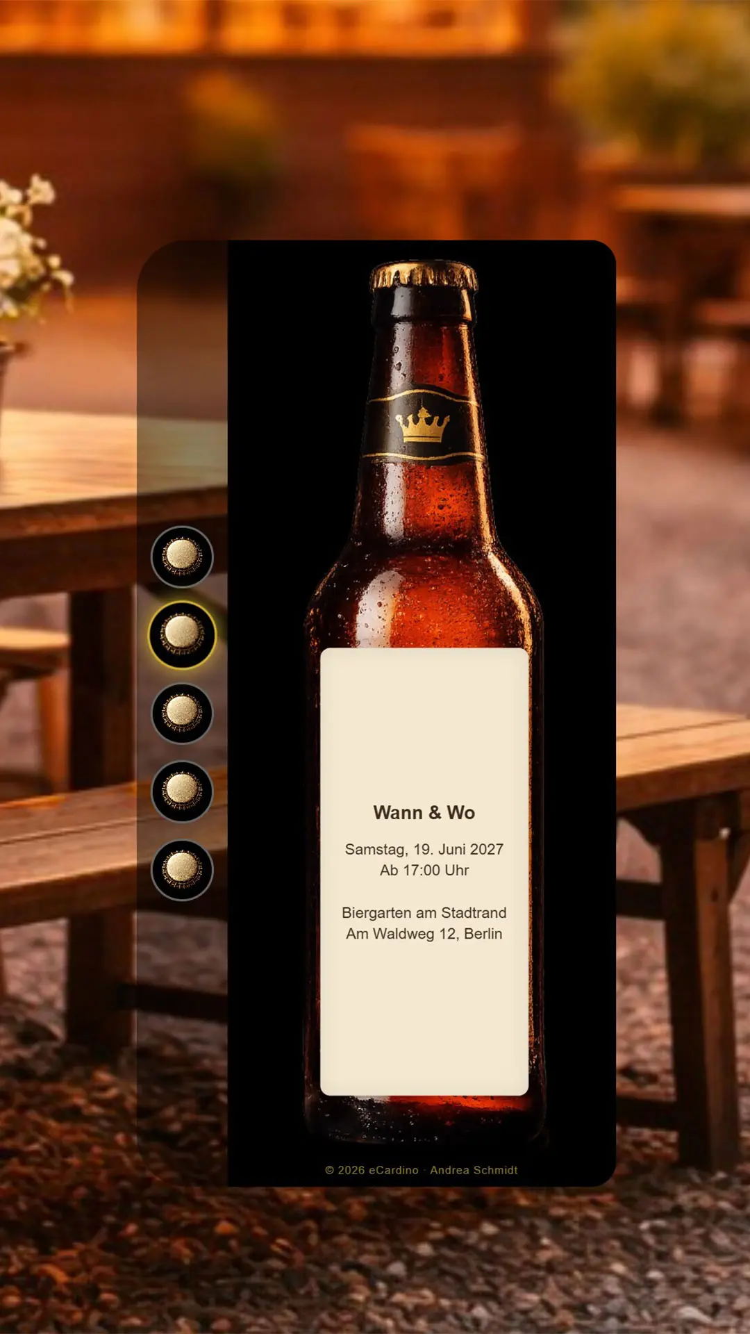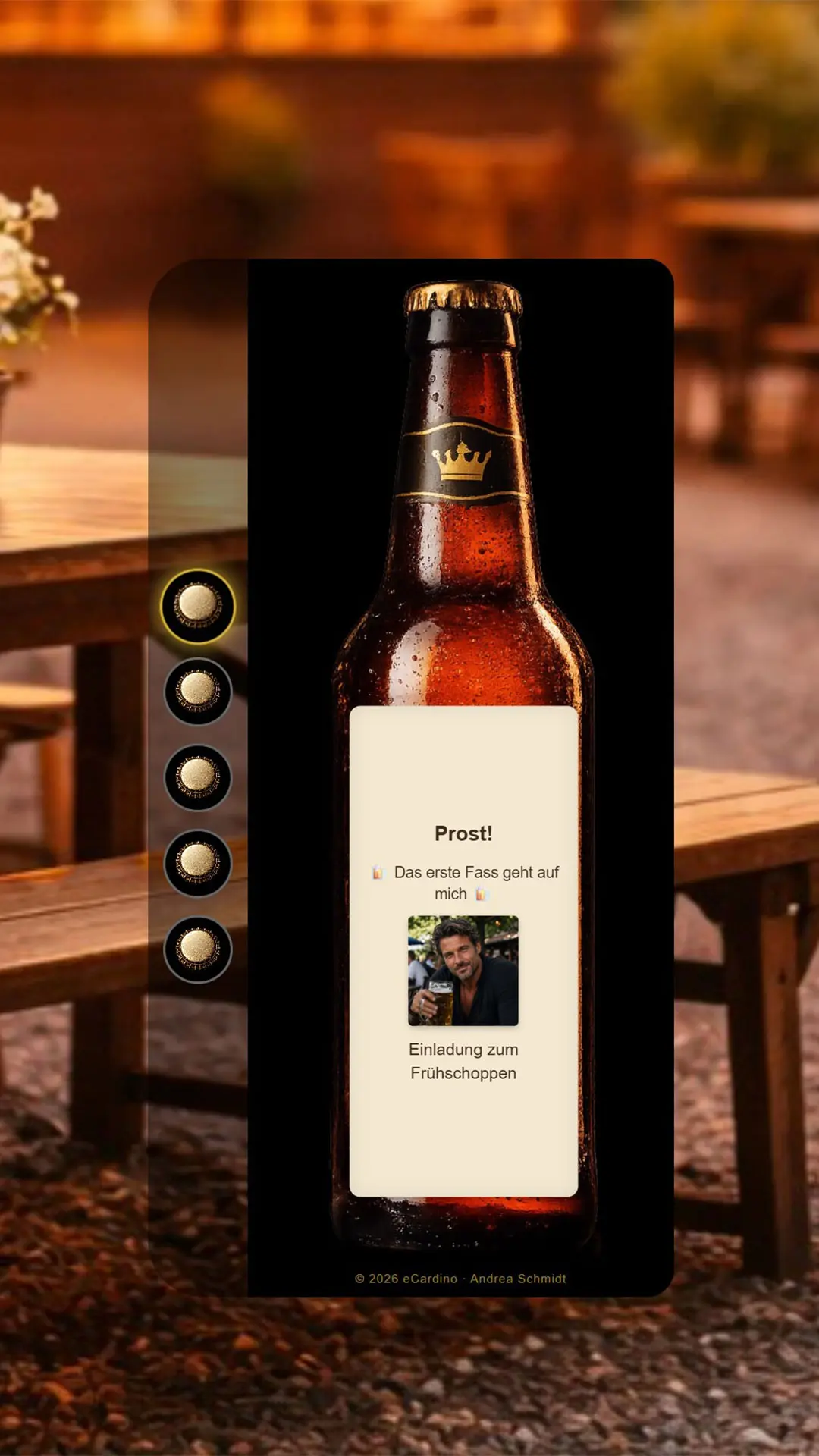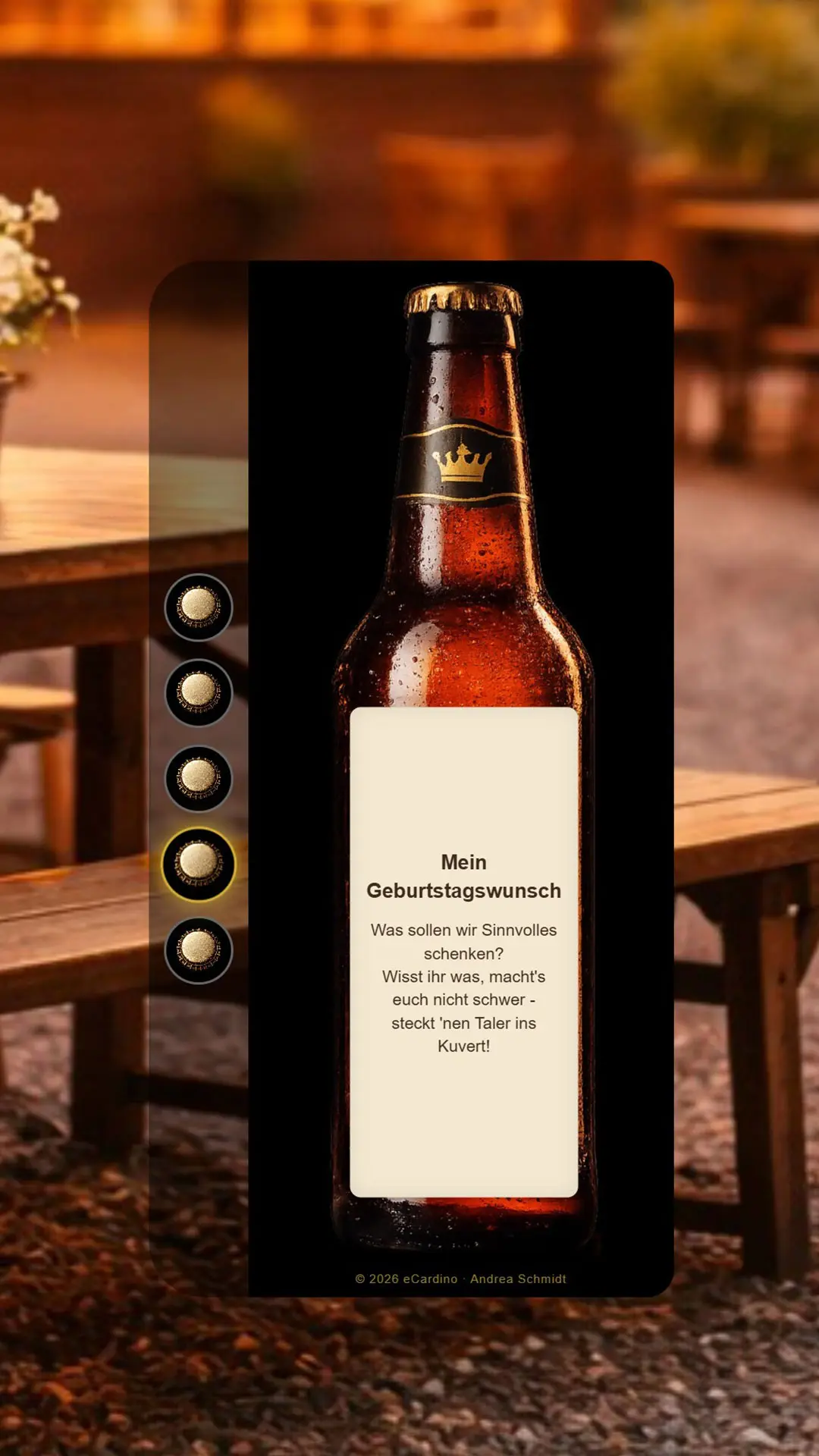 Das eCardino-Design zeigt einen goldenen Kronkorken auf einem warmen Biergarten-Hintergrund. Der Klick öffnet die Flasche mit deinem Namen auf dem Etikett, dazu zischt der Sound und Bier läuft ins Glas. Jede Bierflasche steht für eine Slide: Begrüßung, Anlass, Datum, Rückmeldung.