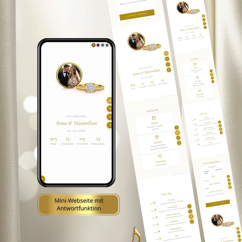 Digitale Hochzeitseinladung mit Rückmeldung als persönliche Mini-Website - animiert, mit Musik, Countdown und direkter Zu- oder Absage der Gäste. Hosting-Einrichtung innerhalb von 24 Stunden, direkt per WhatsApp-Link verschickt. Änderungen bis zum Hochzeitstag ohne Aufpreis möglich.