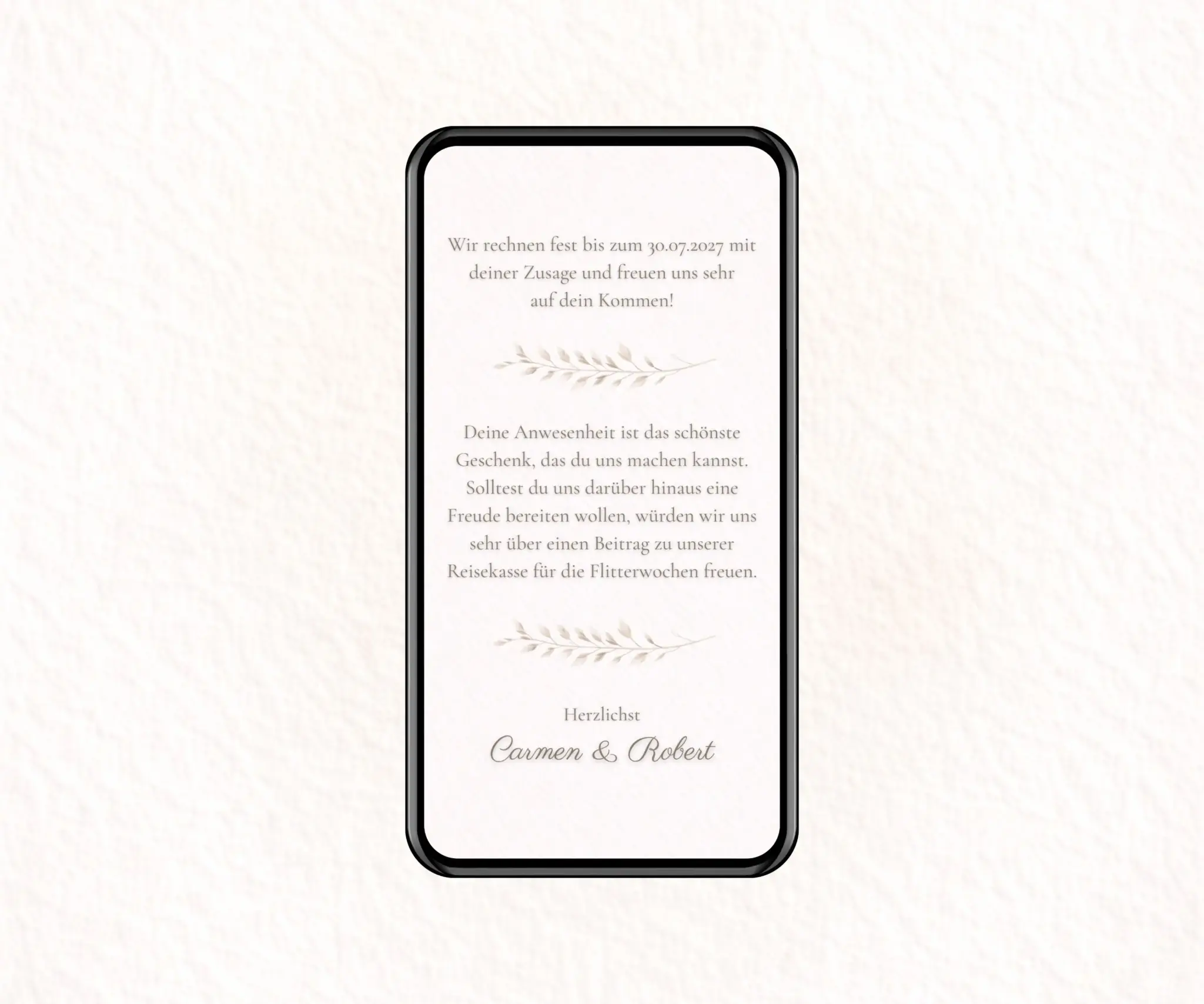 💍 WhatsApp-ready - Eure Gäste öffnen die Einladung direkt am Handy. Kein Drucken, kein Warten auf die Post. Änderungen sind bis zum Hochzeitstag ohne Aufpreis möglich.