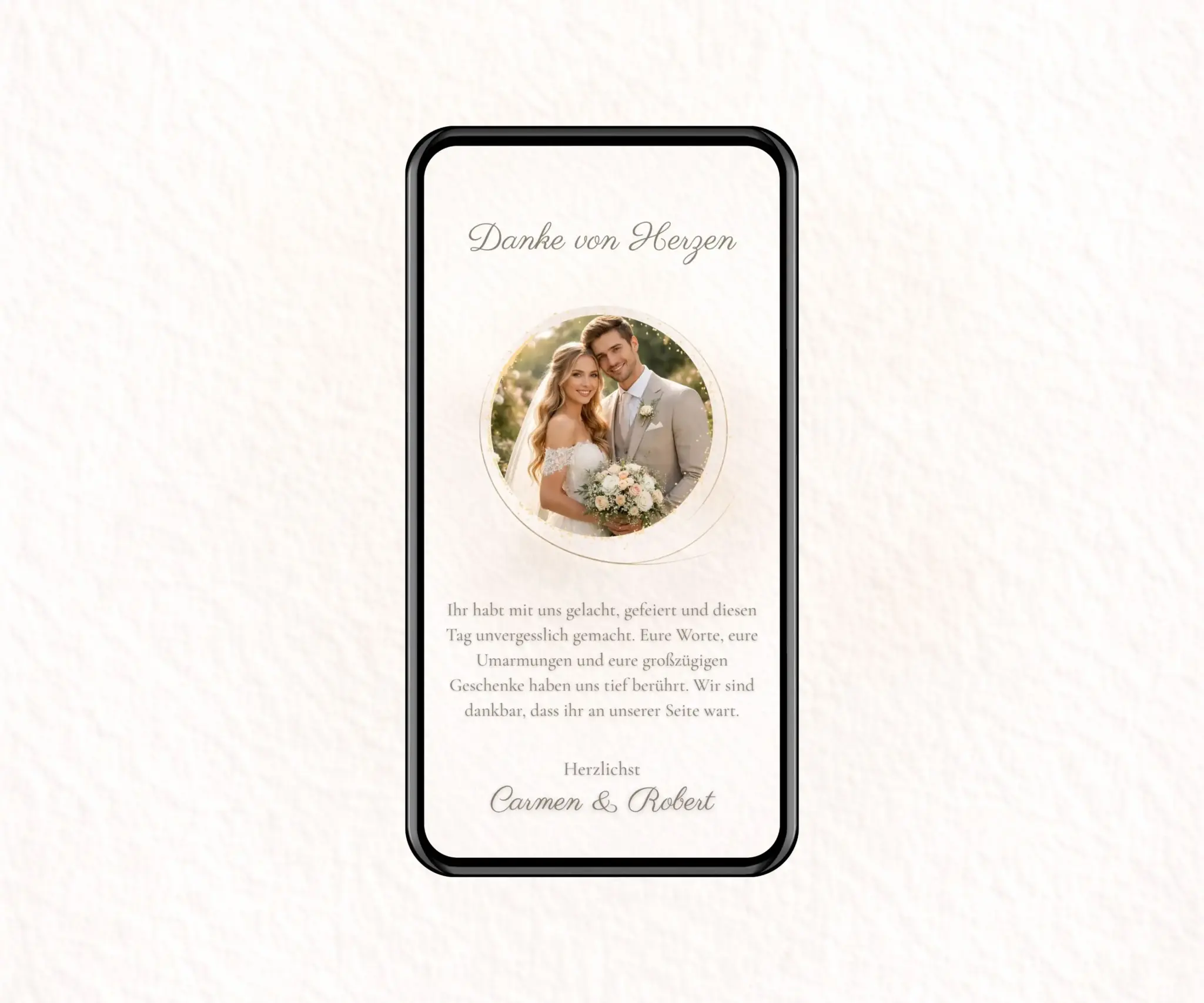 Das Beste daran? Zu jeder Einladung bekommt ihr die Danksagung inklusive. Nach der Feier schickt ihr das Dankevideo per WhatsApp. Mit eurem Foto und persönlichem Text.