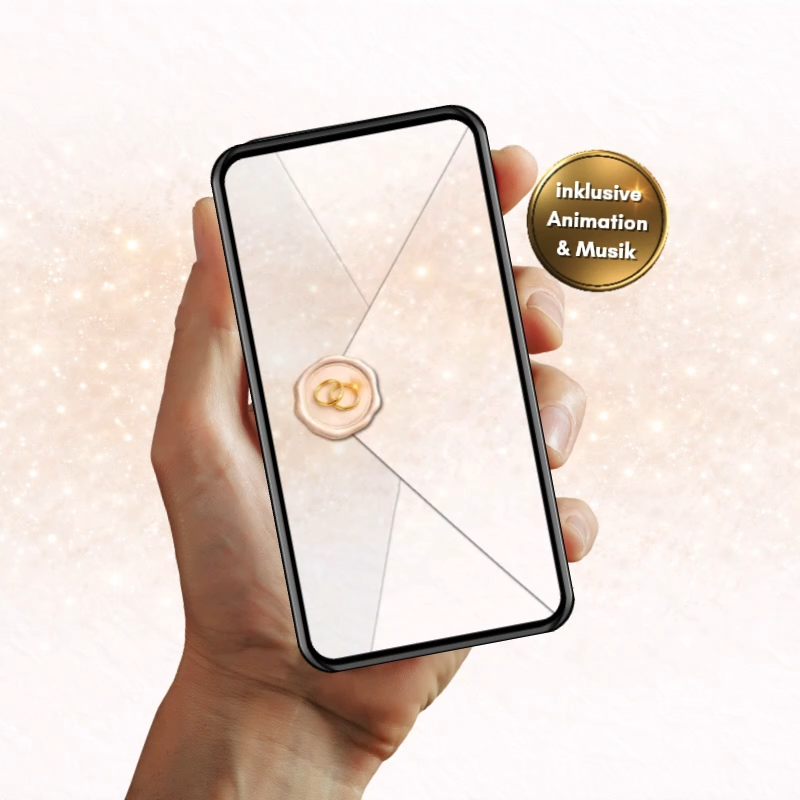 💍 Animierter Briefumschlag mit Siegelwachs - Der Umschlag öffnet sich, die Einladung erscheint. Mit lizenzierter Musik, eurem Text und dem kompletten Hochzeitsablauf. Dazu bekommt ihr die Danksagung inklusive.
