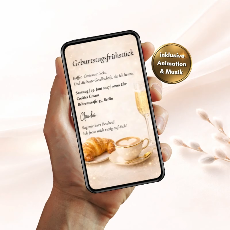 Das Design ist Trend 2026 - beige, minimalistisch, warm. Ein Champagnerglas, ein Croissant, ein Cappuccino mit Herzschaum. Die Einladung wirkt wie ein Morgen, auf den man sich freut. Du gibst deinen Namen und deine Daten - ich setze sie ein und schicke dir das fertige MP4-Video.