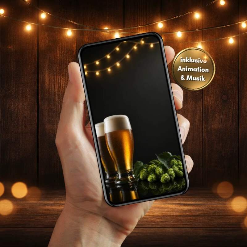 Meine Einladung Geburtstag Frühschoppen gestalte ich als animiertes MP4-Video im Hochformat. Zwei frisch gezapfte Weizenbiere stehen auf spiegelnder Fläche, darüber schwingt eine warme Lichterkette, im Vordergrund liegt frischer Hopfen. Die Schrift setze ich in klarem Weiß, den Namen des Gastgebers in handschriftlicher Signatur. Jede Einladung entsteht bei mir als Unikat - keine Vorlage, keine Template-Masse.