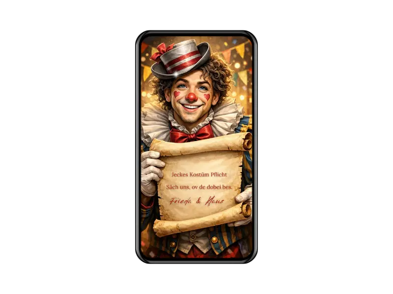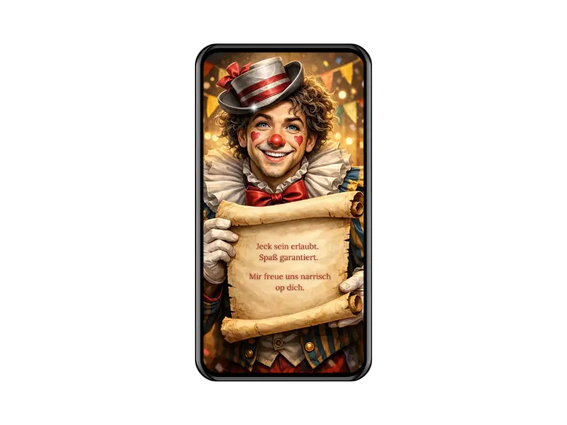 Für mich ist zum Fasching ein Clown immer die richtige Wahl. Er zeigt nämlich sofort die Stimmung: freundlich, festlich und einladend. Diese Einladung zum Fasching funktioniert dabei als Mini-Webseite. Deine Gäste öffnen sie per WhatsApp und können direkt beantworten. Der charmante Clown hält dabei eine elegante Pergamentrolle hoch. Darauf steht deine Einladung - komplett mit Animation und stimmungsvoller Karnevalsmusik. Das Besondere? Diese eCard passt nämlich nicht nur zur klassischen Faschingsparty. Sie funktioniert genauso bei Kostümpartys, Geburtstagen im Februar oder Mottopartys. Du bekommst also eine einzigartige Einladung Faschingsparty. Sie geht im Chat-Gewimmel nicht unter, denn die Animation fällt sofort auf.
